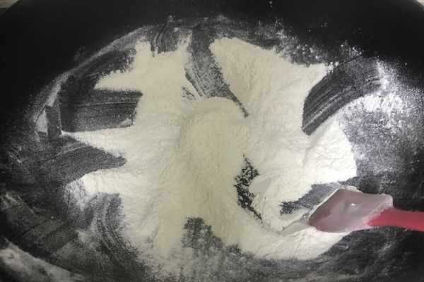 2、將普通面粉和糯米粉放入炒鍋中,開啟小火翻炒至微微變黃,可以聞到面粉的麥香味即可,如圖所示。