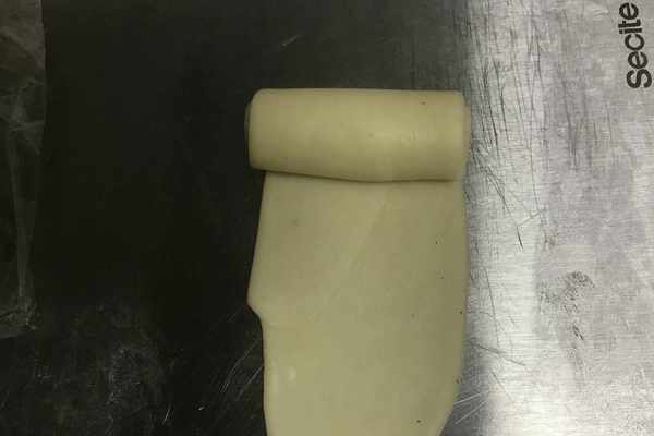 16、將卷過一次的面卷,再次按照操作順序,同樣是用搟面杖再次搟長,自一端向另一端卷起來,如圖所示。