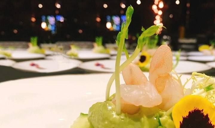 蝦仁200克、牛油果6個、檸檬酵素5毫升、黃瓜1個、豌豆苗、三色堇、油菜花5個、冰糖10克、橄欖油15毫升