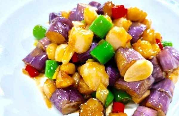 鮮貝肉250克、杭茄子200克、青紅椒丁30克、蒜片、薑片、香蔥、美極鮮味汁15克、雀巢辣鮮露5克、雞粉3克、蠔油6克、白糖3克、味精3克、胡椒粉1克、薑汁酒3克、色拉油、花生油、玉米淀粉、生粉水、香麻油