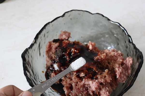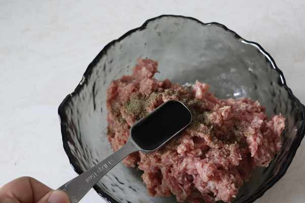 豬肉攪成肉餡,放入1小勺黑胡椒粉,2大勺生抽醬油,1大勺蠔油