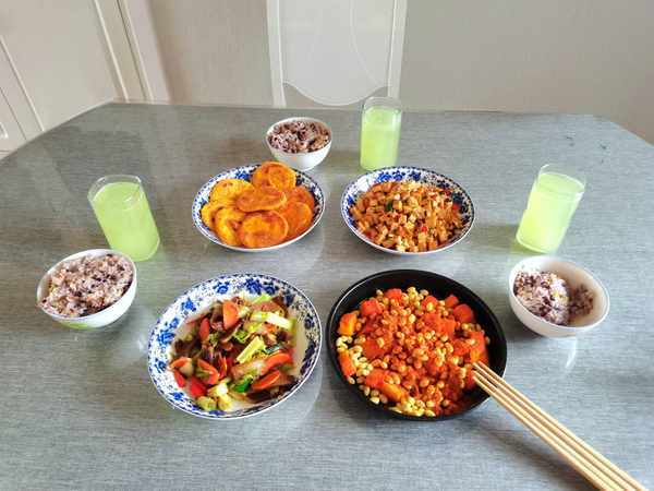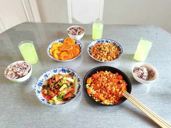 1、午餐:椒鹽烤南瓜黃豆,肉片炒紅蘿卜芹菜,麻婆豆腐,糯米南瓜餅,芹菜汁,雜糧米飯。