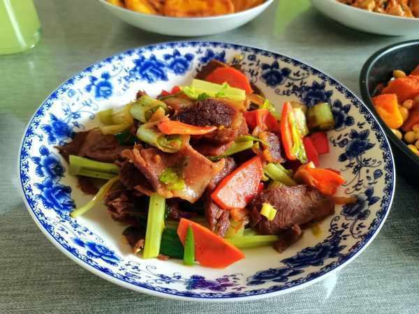 9、肉片炒紅蘿卜芹菜,一塊熟肉,切片後煉幹上面的油脂,放入紅蘿卜和芹菜炒一分鐘,撒鹽、五香粉、味極鮮出鍋。