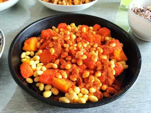 南瓜烤好後,拿出來,放上半碗熟黃豆,撒上椒鹽,再次放入烤箱烤10分鐘。