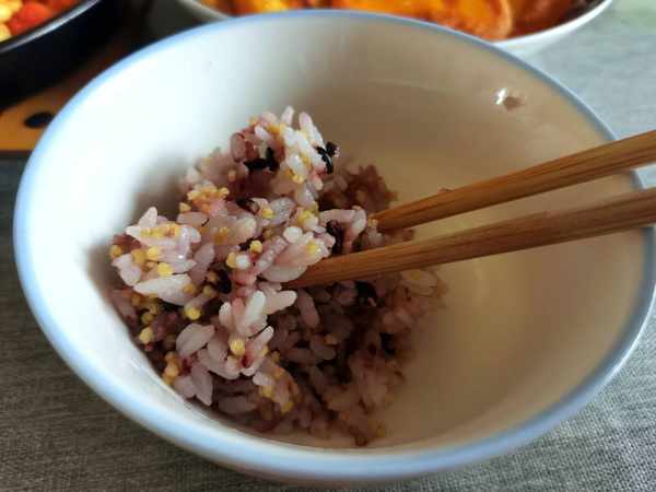 10、雜糧米飯,裡面放瞭黑米、小米,給自己盛瞭一大口,有瞭糯米南瓜餅,米飯我就吃得少瞭。