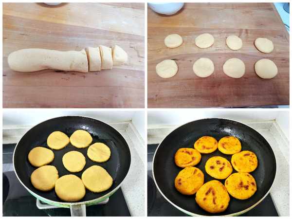 3、把面團揉光滑,分成大小均勻的面劑子,每一個面劑子就是一個小餅,壓扁搟開,放入刷過油的煎鍋,煎至兩面金黃出鍋。