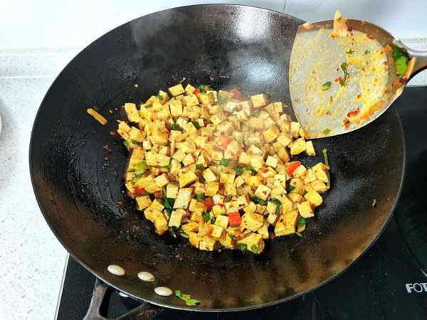 6、再來炒一盤麻婆豆腐,麻婆豆腐做法是最簡單的,鍋裡熱油,放一塊麻辣料汁,炒香後放蔥花蒜末、紅辣椒丁,再倒入豆腐丁,翻炒一分鐘,倒入半碗開水,把豆腐燉一分鐘,撒香菜蔥花出鍋。