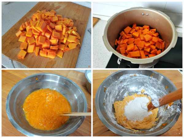 南瓜片放盆裡,用搟面杖搗成南瓜泥,然後加入適量糯米粉,這裡可以根據南瓜的含水量準備糯米粉,面團太軟就再加糯米粉,揉成一個偏軟的面團。