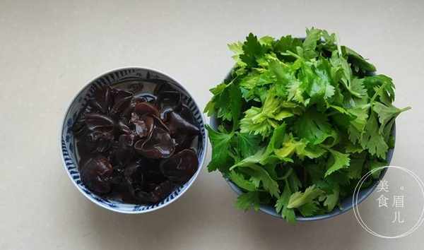 第一步,芹菜葉子太老的就摘掉不要瞭,比較鮮嫩的留著,木耳提前冷水泡發,全部都清洗幹凈。