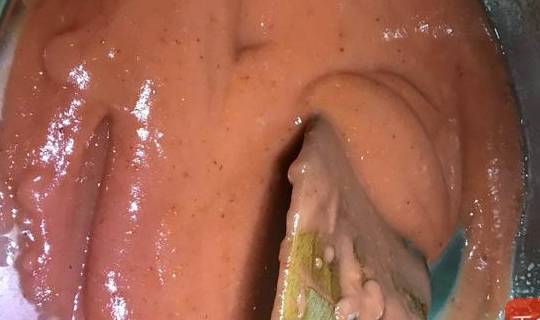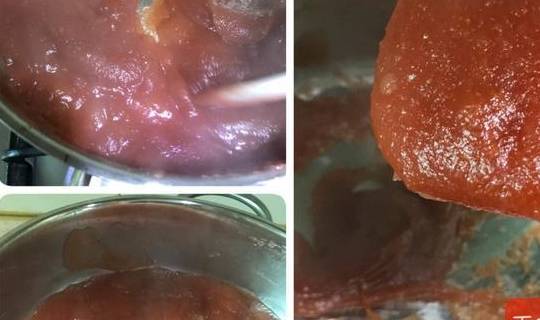 11.中小火慢慢翻炒、顏色會越來越紅,水分變少、直到變得粘稠用鏟子鏟起也不滴下的樣子關火(此過程耗時較長,差不多30-40分鐘)。