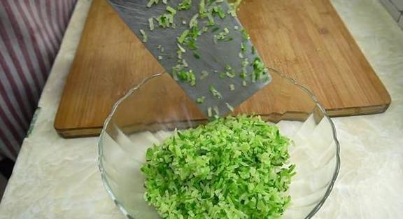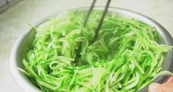 8、蘿卜絲放涼以後,用力把裡面的水分擠出來,然後放到案板上切碎,裝入盆中備用。