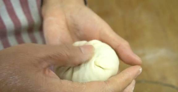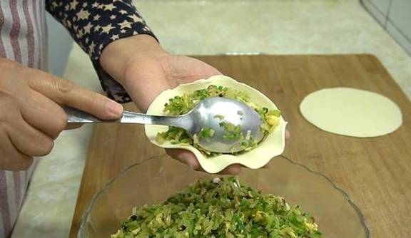 13、再用搟面杖搟成四周薄、中間厚的圓皮。中間多放點餡料,用包包子的手法將餡料包起來。