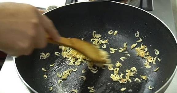7、另起鍋,稍微放油,再下入一把蝦皮炒一下。炒出香味,表面發黃就可以瞭。