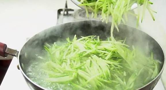 4、準備一鍋開水,下入剛才擦好的蘿卜絲,焯水1分鐘之後撈出來,不需要煮太久。這種青蘿卜做餡料會帶有一些辣味,焯水就能很好地去除辣味。