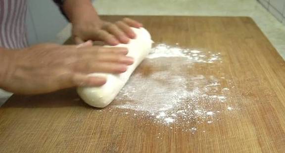 11、案板上撒上一些幹面粉,醒好的面不需要再揉,直接搓成長條。