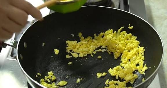 2、煎雞蛋碎的時候,熱鍋放油,油溫低一點的時候倒入雞蛋液,這樣煎出來的雞蛋會比較嫩。