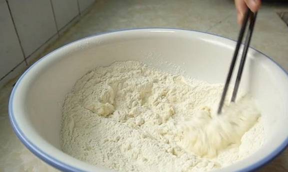 1、盆中加入400克面粉,用80度左右的熱水燙面,邊加水邊攪拌,水的量大概需要240克。