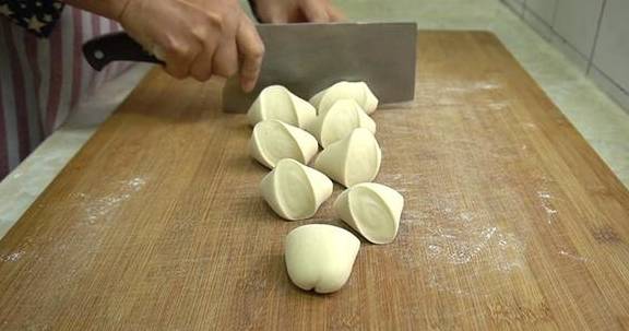 12、將面團分成大小均勻的面劑,比包水餃的劑子稍微大一點。把每個面劑揉圓,再用手按扁。