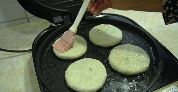 15、電餅鐺預熱刷油,油熱後擺入餅胚,在餅子的表面也刷上一點點油,目的是鎖住餡餅的水分。蓋上一個高一點的蓋子,單面小火烙2分鐘。