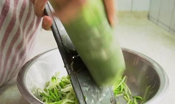 3、準備一根洗凈的青蘿卜,直接用擦網擦成細絲。