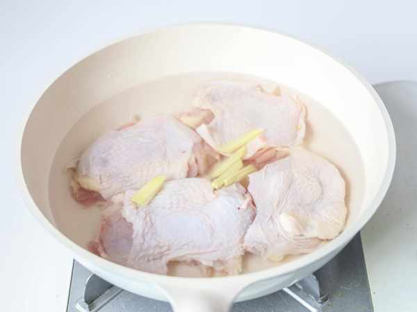 2.雞腿冷水下鍋,加蔥薑 料酒煮熟,水開煮10分鐘,關火燜10分鐘差不多,不放心可以多煮一會,煮熟的原湯留一碗備用