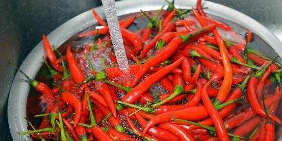 先把準備好的紅辣椒1000克全部用清水沖洗2遍洗去表面灰塵泥污,瀝幹水分後放到太陽底下或者通風處自然晾幹,備用