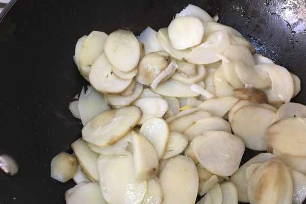7.熱鍋熱油放入茨菇片翻炒。