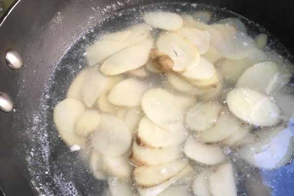 4.鍋中放入水加二克鹽大火燒開,把茨菇放入鍋中焯水三分鐘,撈出茨菇片並清洗幹凈。