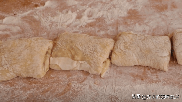 9.從一頭把它卷起來,然後切成小面劑子。每一份都按扁備用。