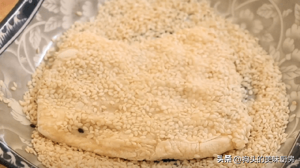 10.準備一盤芝麻,生坯沾點水,放入芝麻中,兩面都黏上。全部按照這個步驟做好。