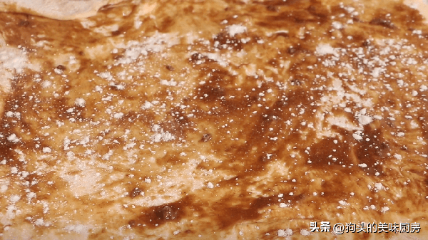 8.整理一下把它搟成長方形面片,厚度在0.3-0.5厘米左右就可以瞭。一定要加多一點面粉,不然太粘瞭。接著塗抹上一層芝麻醬。