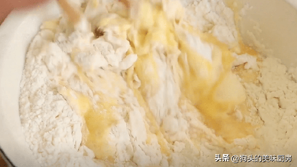 3.300克面粉倒入盆中,倒入酵母水跟雞蛋液,把它攪拌均勻。