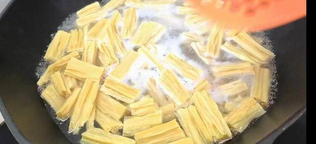 燒一鍋沸水,往水中放入一點食用鹽,將腐竹焯燙一下,焯燙好之後直接撈出,不用過涼,焯腐竹的時間大概控制在兩三分鐘就行。