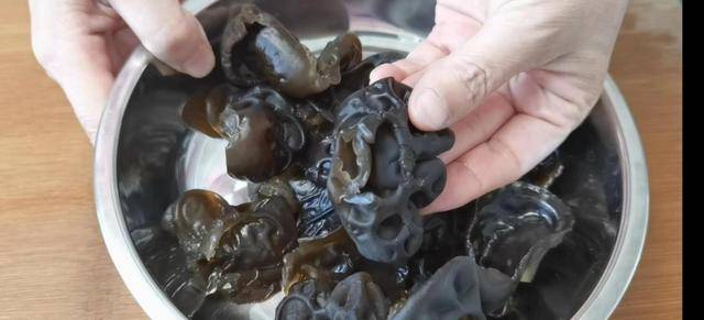 再準備一點新鮮的木耳,木耳提前給它焯一下水,焯好水之後放入冷水中過一下涼,如果木耳有根部的話,一定要記得用小剪刀將其剪掉。