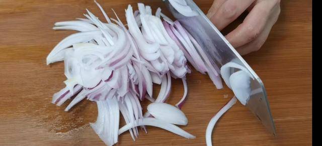 準備洋蔥半個,從中間劈開之後切成細細的洋蔥絲。建議您選用紫皮洋蔥,它裡面不僅水分多,口感甜,而且花青素含量也比較高,切好之後裝入小盤中備用。