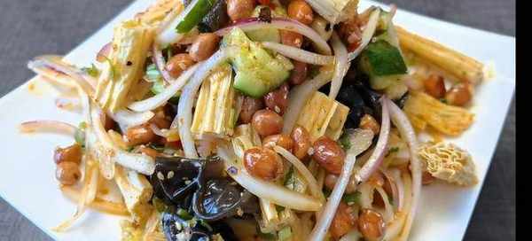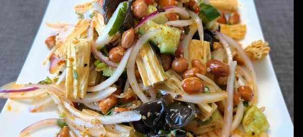 最後準備一個大碗,把已經切碎的洋蔥絲鋪在碗底,接著放入之前已經切好的各種配菜蔬菜,包括黃瓜、木耳、腐竹,之後就是淋入我們剛剛調好的醬汁,這個料汁呢,相對來說有些微辣,如果傢裡有孩子的話,您可以把小米辣和辣椒粉替換掉,這樣做出的口感呢,咸甜適中,就不會過於辣瞭。最後把花生米加進來。抓拌均勻。