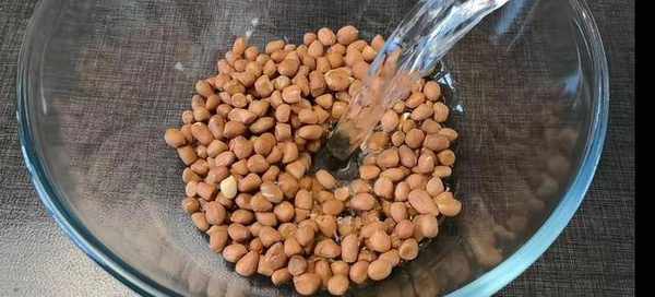 趁這個時間我們處理一下其他的配料,準備一些花生米,放入大盆中之後往裡面加入一些溫水,輕輕的搓洗一下,洗掉表面的浮灰灰。稍稍搓洗一下,不僅可以清洗掉灰塵,同時可以讓花生表皮吸收掉一些水分,這樣在一會兒炸的過程中,表皮就不會發黑發苦,更加不容易將其炸糊。洗凈之後再放到流動的清水下沖一沖,之後放在一旁控水,瀝幹水分後就可以下油鍋瞭。