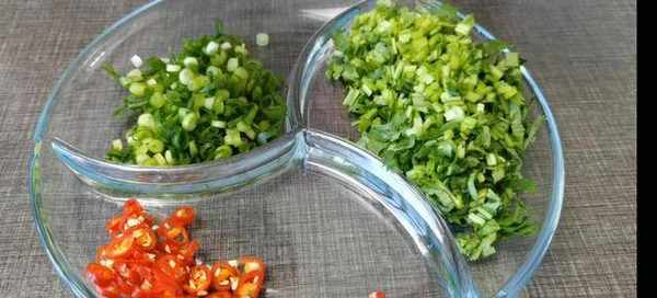 炸好的花生米先放在一旁,接著咱們準備小香蔥兩根,洗凈之後將其切成蔥花。準備兩個小米辣,切掉辣椒蒂之後將辣椒切成辣椒圈,不太能吃辣的朋友可以把這種小米辣換成拇指椒,味道沒這麼辣,同樣可以達到配色效果。