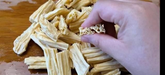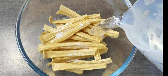 今天我們大概需要用150克腐竹就行,不用特別多,買回的腐竹放在手裡輕飄飄的,我們可以給它掰成小段,泡的時候橫截面接觸水的地方比較多,更容易泡軟。把腐竹掰成小段之後放在一個盆中,接下來就需要把它泡軟瞭,泡軟之後咱們才能來烹飪,在浸泡的過程中,可以往裡面放上一點白醋,這裡面的醋酸物質。讓腐竹更快的被泡軟,同時這裡面的醋酸還可以讓腐竹減少豆腥味兒。之後往裡面放上一些食用鹽,加入鹽之後泡的速度也可以更快,而且這腐竹加鹽泡之後會變得更加筋道,不管您是燒著吃、炒著吃還是涼拌著吃,它的口感都會更加好。