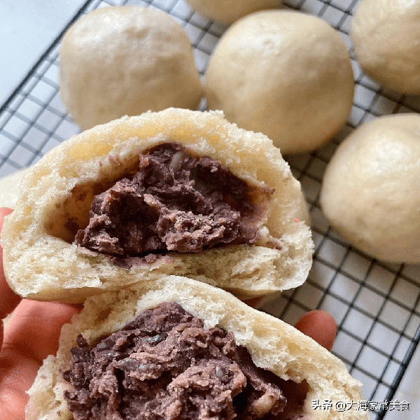 步驟二:盆中加入適量的清水和面粉,和面,加入一袋酵母菌,醒發之後,將面團搟成包子皮,然後將紅豆沙包入其中,用手團成豆沙包的形狀。