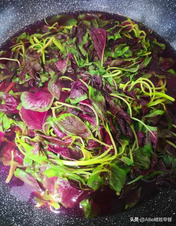 水開後倒入莧菜,煮約20秒撈出控水。