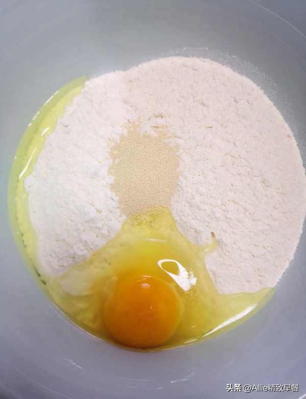 碗中加入全麥面粉、高筋面粉、雞蛋、酵母。
