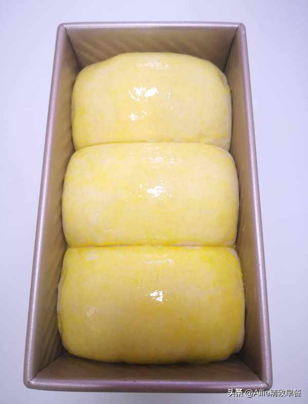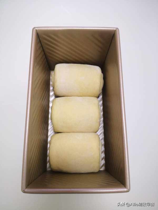 3.我做的是山形吐司,二發至吐司盒的九分滿;如果做方形吐司,二發至吐司盒的八分滿,烤的時候需要蓋上吐司盒蓋。
