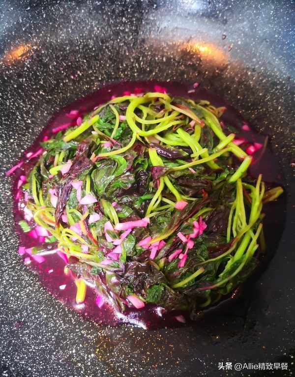 另起鍋,倒適量油,倒入蔥花、蒜泥炒出香味,倒入莧菜,加點鹽翻炒至入味均勻即可。