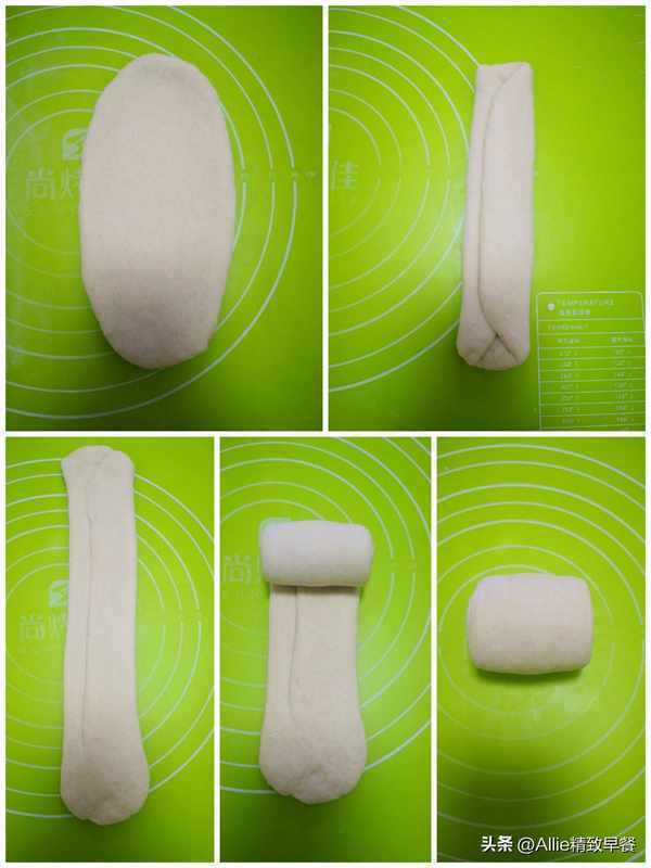 面團松弛好後,先取一個面團,剩下的面團要繼續蓋上保鮮膜,防止風幹,把面團搟成牛舌狀,如下圖折起來,按扁些,接著搟長再卷起來,收尾處要按壓打薄再壓在面團底部,生胚卷就做好瞭,生胚卷的長度要小於吐司盒的寬度。