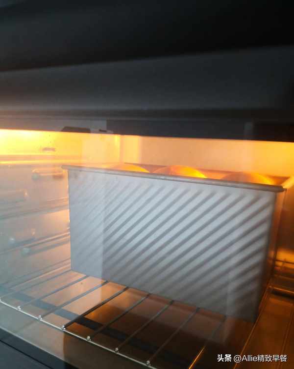 4.烤箱預熱200度,再調整到180度,這樣爐內的高溫會使吐司長得更高;我試過烤箱預熱溫度為180度,烤制溫度也是180度,烤出來的吐司高度明顯不如用預熱溫度為200度烤出來的高度,大傢可以試一試。