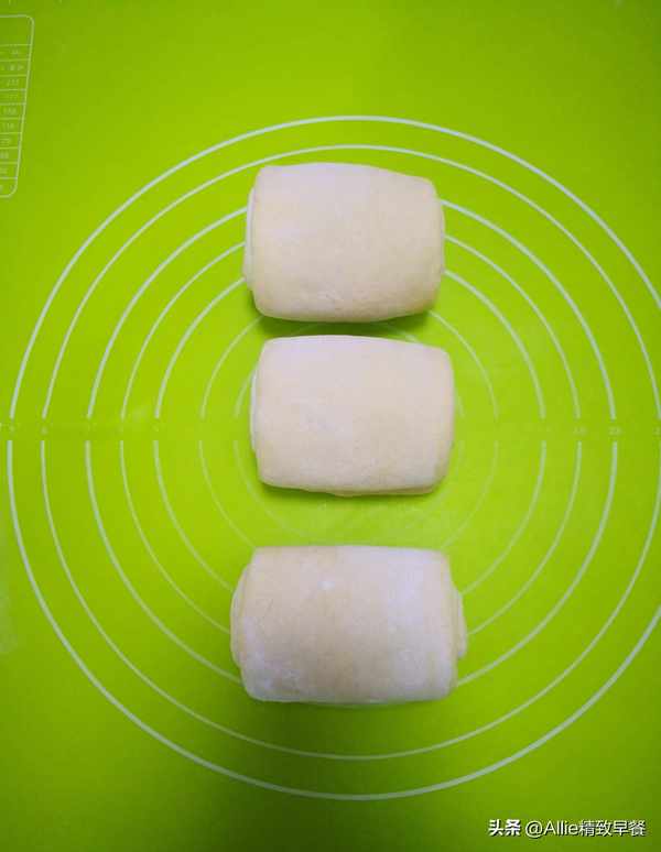 取出發酵好的面團,揉面排氣,再分成三等份並揉搓成圓,蓋上保鮮膜,松弛約15分鐘。