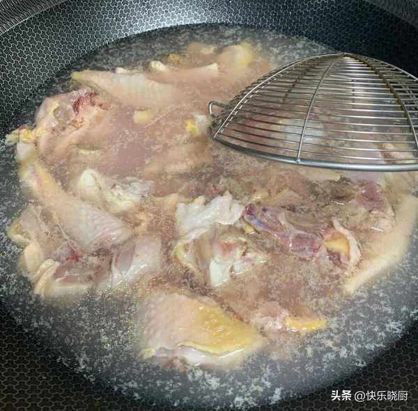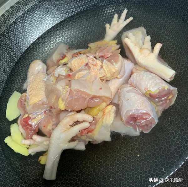 3.把雞肉冷水下鍋,並加入蔥段,薑片,蒜瓣,料酒焯水