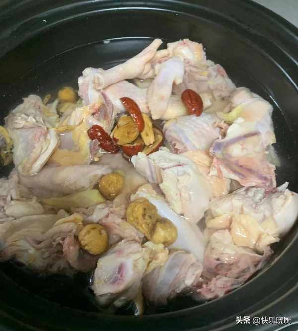 5.將焯過水的雞肉放入砂鍋中並加入椰子水,適量清水,放入紅棗,枸杞,無花果,大火燒開後轉小火慢燉1小時