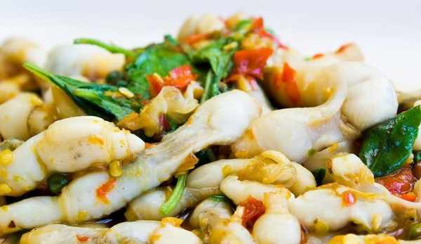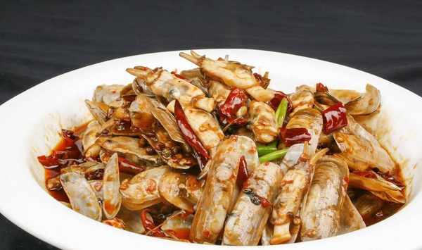 3、把蔥薑蒜、小米辣、幹辣椒這些全部切好備用,鍋內倒油燒熱,然後把切好的這些調料放進去,爆香。隨後加上蟶子,不停翻炒,炒制一段時間以後,我們加上適量的白糖、生抽、老抽、蠔油,再來一點辣椒醬調味。